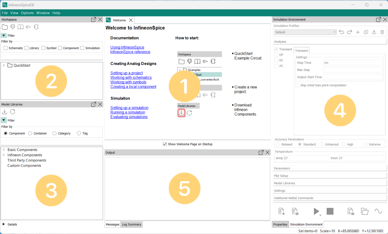 When you have installed InfineonSpice and start it for the first time, you are presented with the design environment: