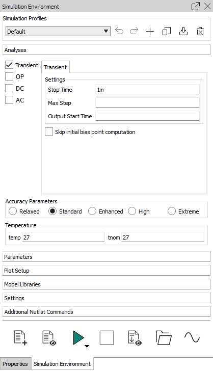 Simulation profiles let you store settings that you commonly use. They can be recalled simply by choosing them from the Simulation Profiles menu.