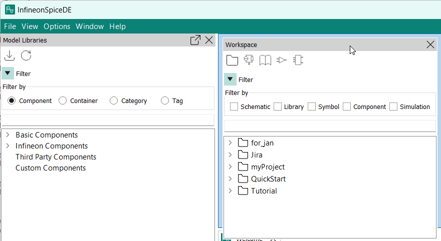 The toolbar of the Workspace and the Model Libraries views can also be shown and hidden via the View menu.