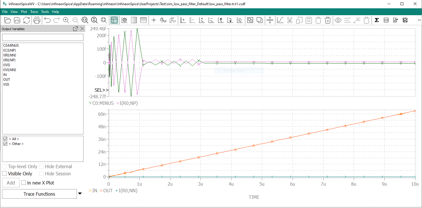 Simulations are evaluated in InfineonSpice’s Waveform Viewer module by examining the plots from the simulated values.