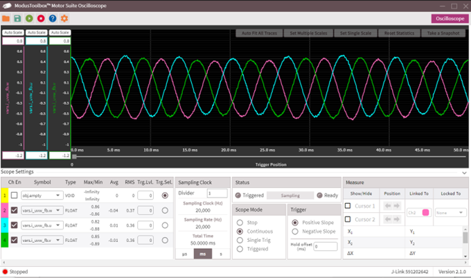 ModusToolbox™ Motor Suite support a high-speed oscilloscope to monitor any firmware variable, at a time it monitors up to four variables. In the oscilloscope window, configure the Divider value and select Auto Scale to get the optimum resolution.