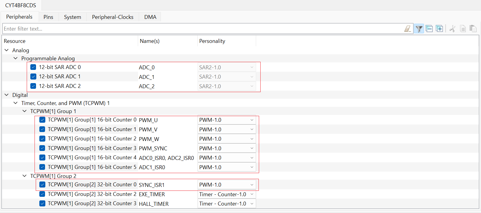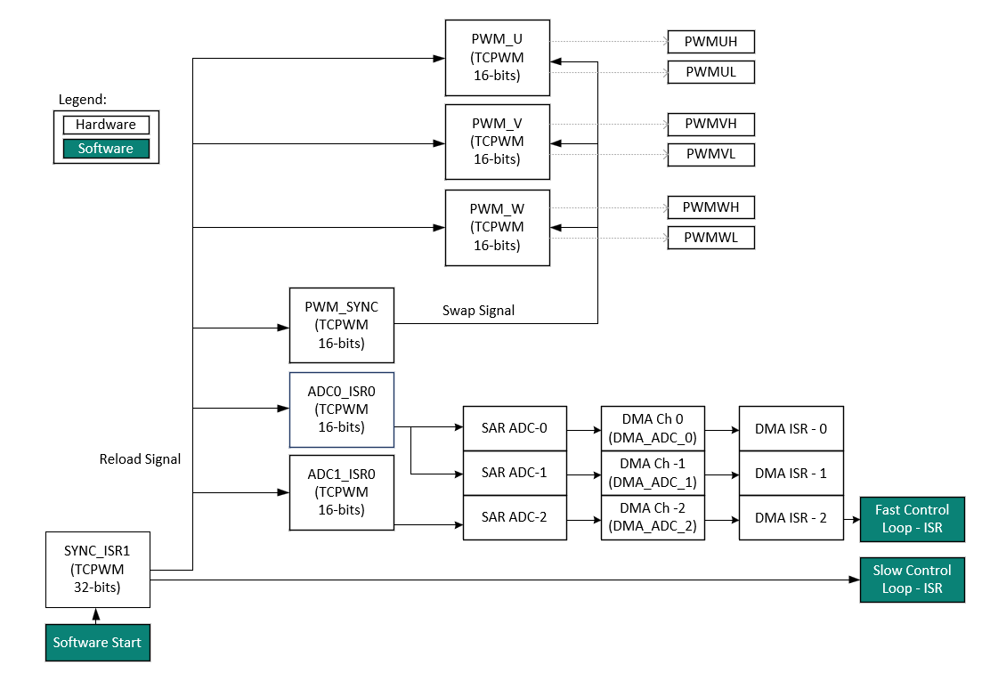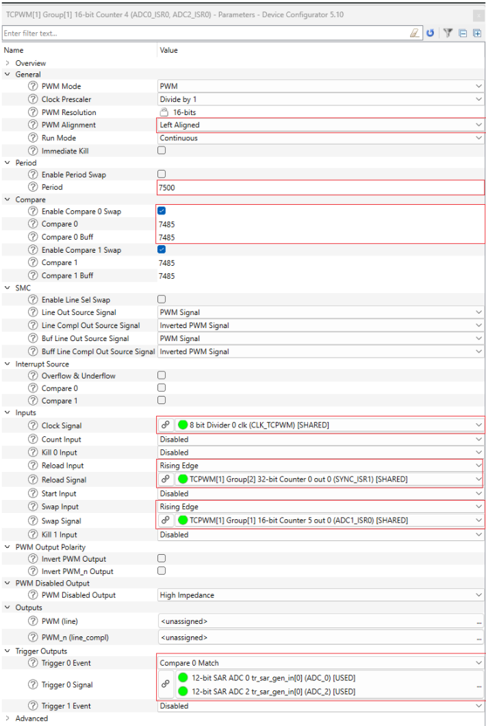 ADC0_ISR1: Start in sync with PWM timers and trigger SAR ADC 0 and SAR ADC 2 | TCPWM[1] Group [1] Counter 5 | |