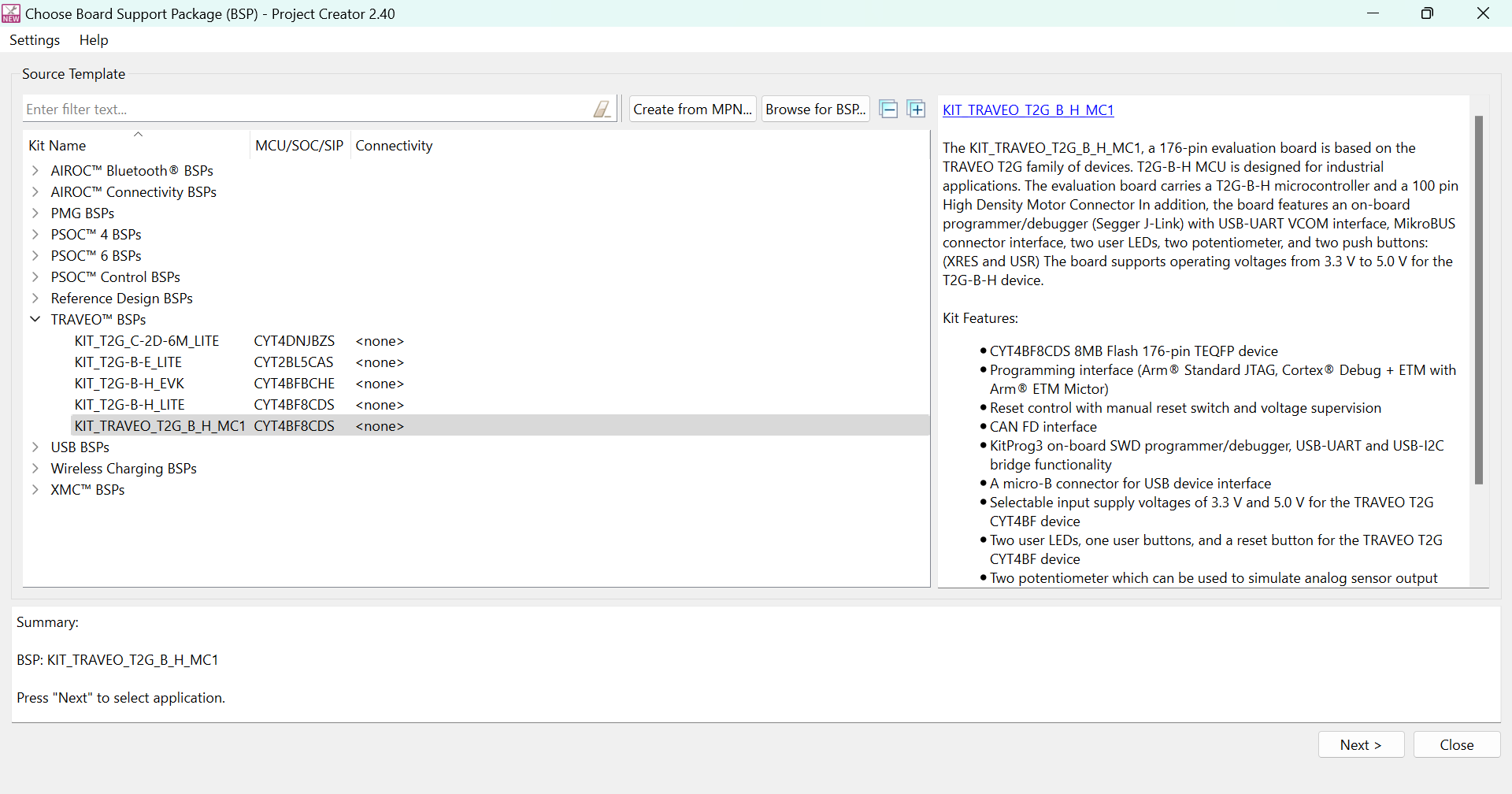 Select the TRAVEO™ T2G CYT4BF Motor Control Drive kit and create a new project. The configurator page will pop-up with an addition icon for the Test Bench.