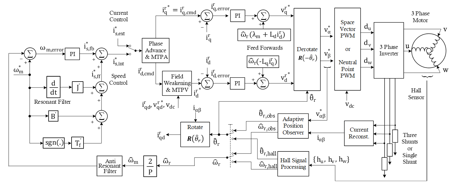 Adaptive sensorless observer that provides minimal phase distortion. It can observe rotor angle, speed, stator angle, stator flux magnitude, and load angle